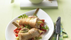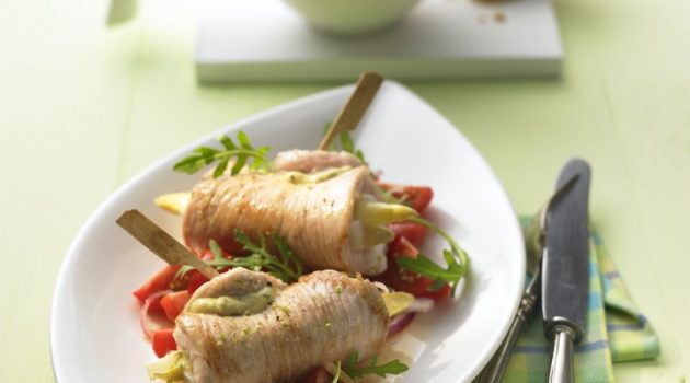 Puten-Spargel-Rouladen auf Tomaten-Rucola-Salat
