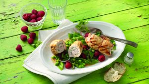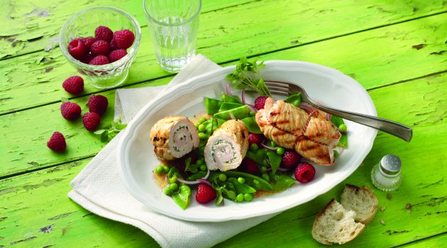 Putenrouladen mit Zuckerschotensalat und Himbeeren