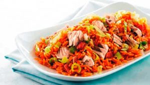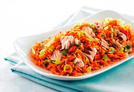 Pilaw mit Thunfisch Pro Person: 283 kcal (1185 kJ), 16,8 g Eiweiß, 6,0 g Fett, 38,0 g Kohlenhydrate Fotohinweis: Wirths PR/J. West Zubereitung:Den Schinken würfeln, die Frühlingszwiebeln in dünne Scheiben schneiden. Das Öl in e...
