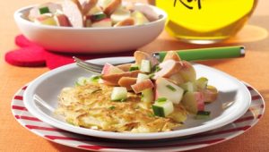 Pro Portion ca. Kalorien: 458 Joule: 1920 Protein: 12,8 g Fett: 30,7 g Kohlenhydrate: 32 g Zubereitung: 1. Würstchen in Scheiben schneiden. Apfel abspülen, vierteln und das Kerngehäuse entfernen. Apfel klein schne...
