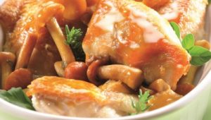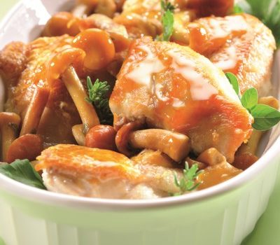 Geschmortes Huhn mit Pilzen und Weißweinessig Zubereitungszeit: ca. 20 Minuten